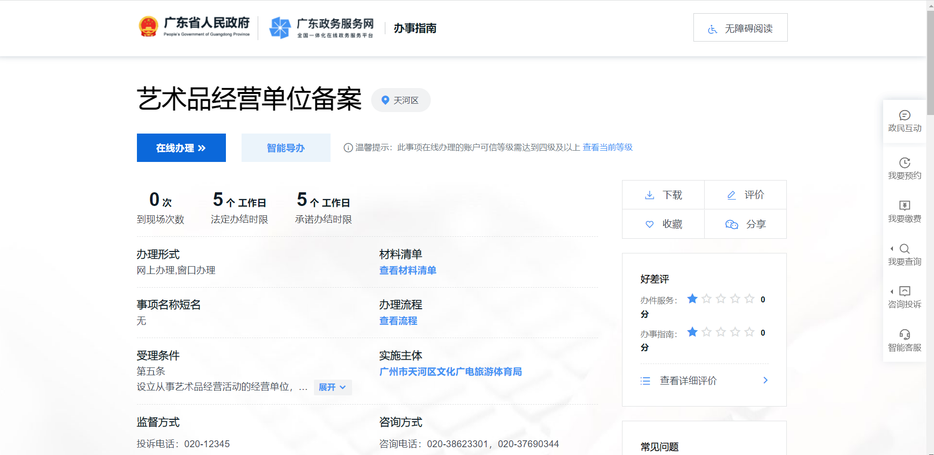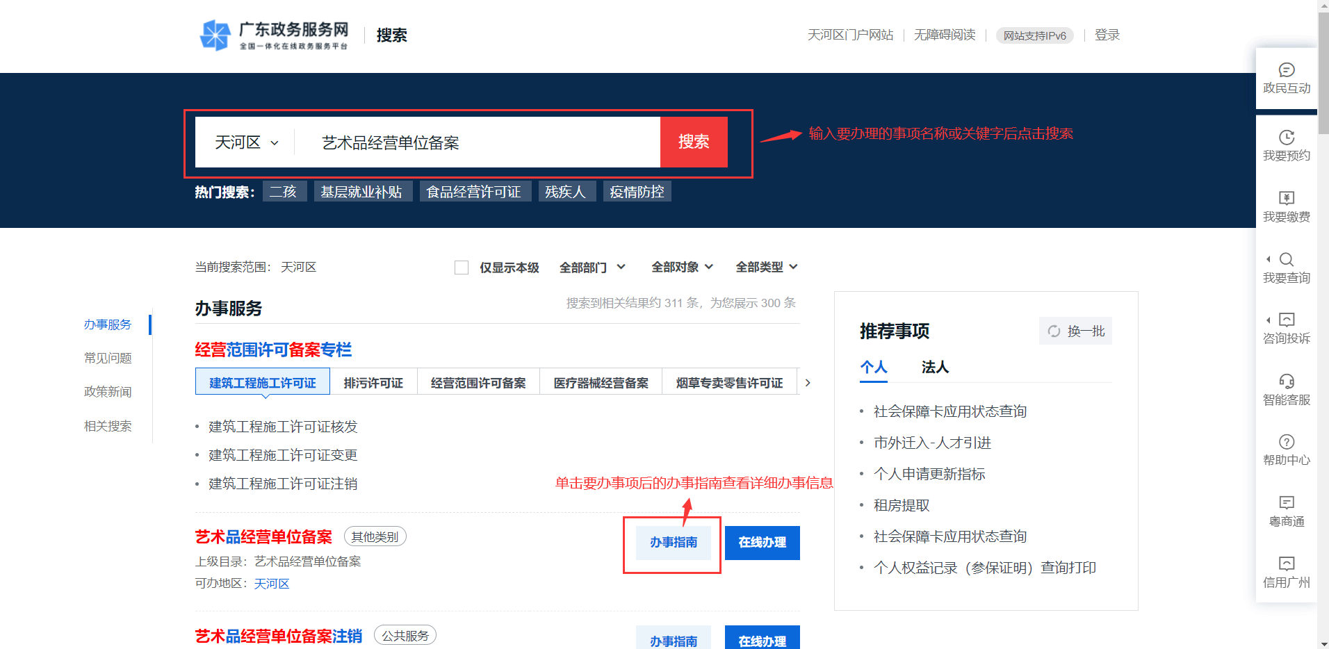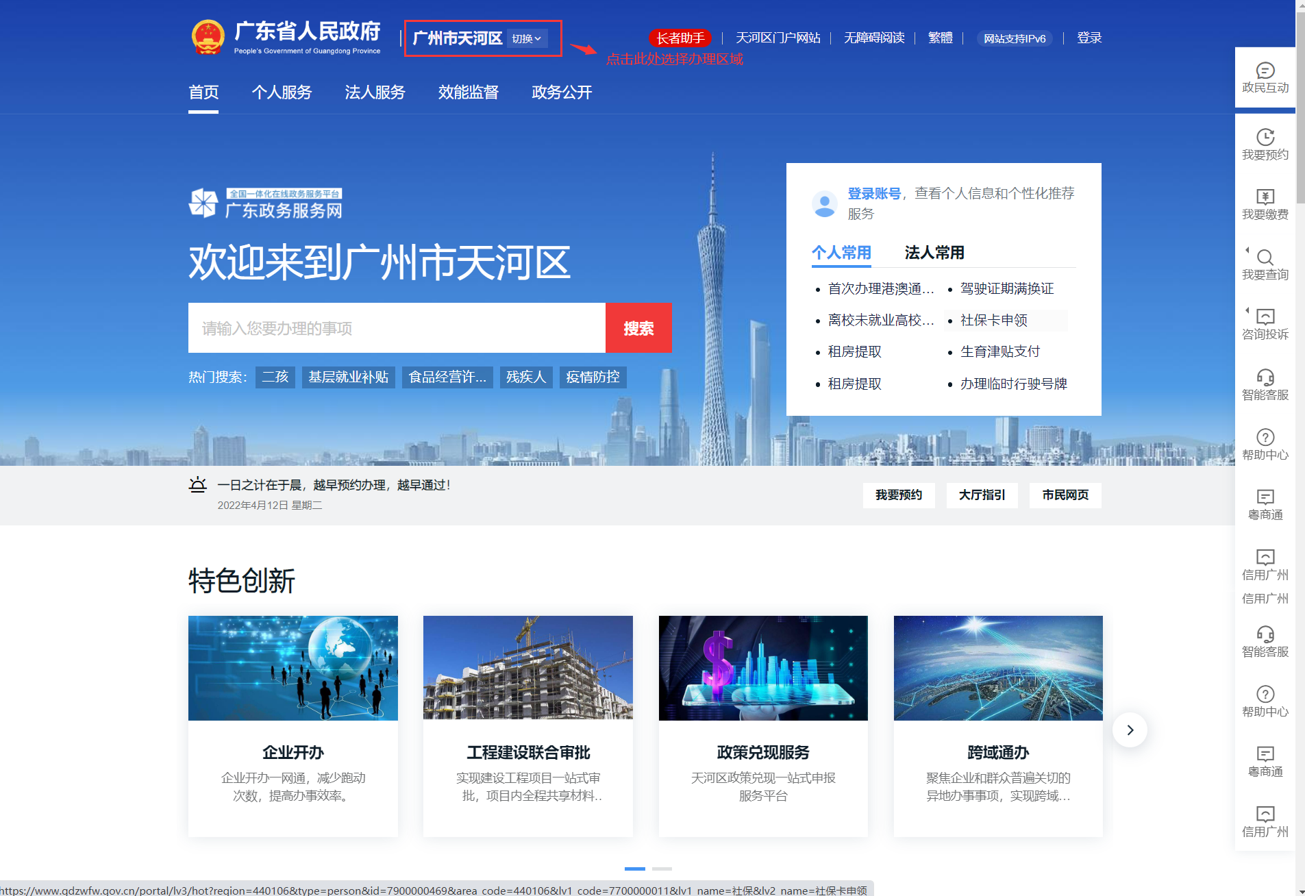 打开广东省政务服务网进入天河专区,网址:https://www.gdzwfw.gov.cn,切换到天河专区,如下图