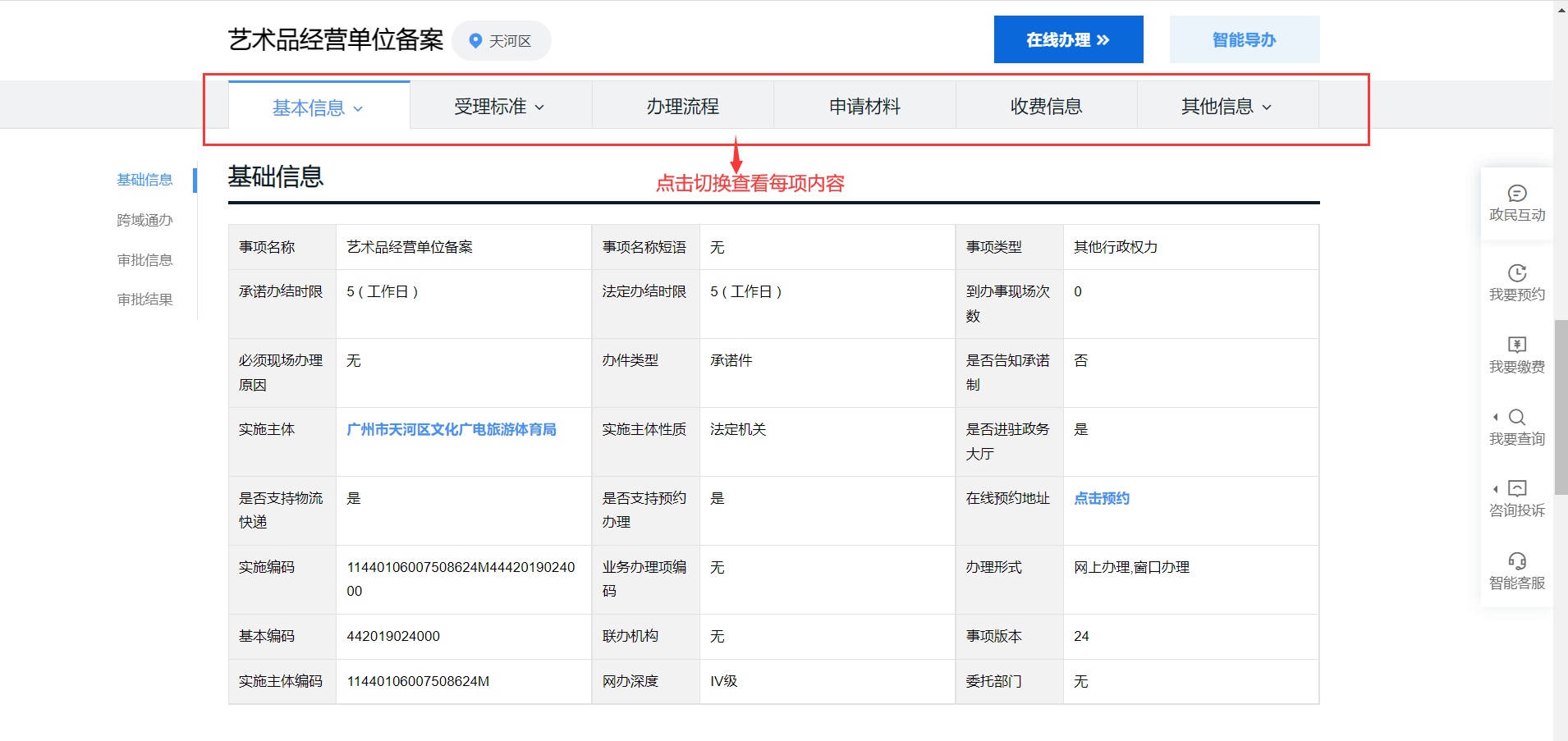 仔细查看办事指南要求,尤其是受理标准和申请材料,可以按照下图切换查看每项内容: