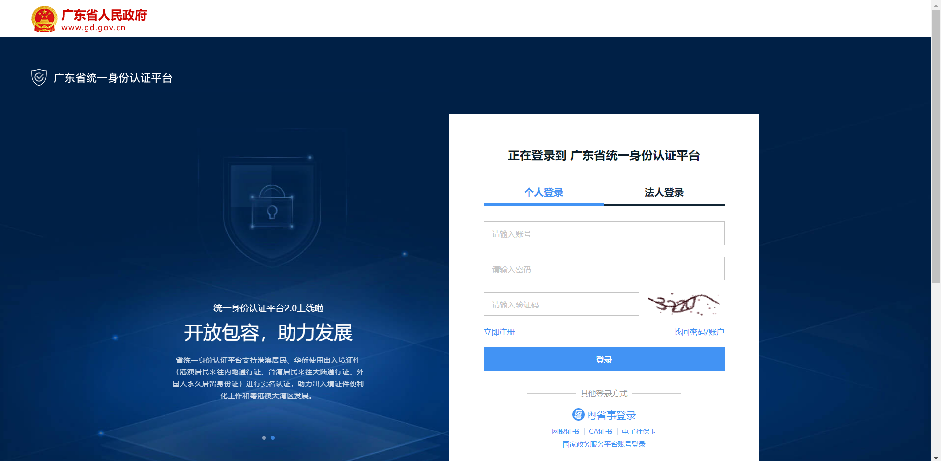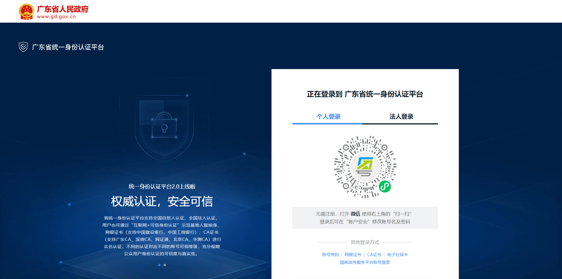 确认符合办理该事项的条件,可以点击上方的在线办理按钮,稍等几秒钟后会跳转到广东省统一身份认证登录页面,推荐使用微信扫码登录,无需注册,也可以点击账号密码切换到账号密码登录、注册或找回密码,如下图: