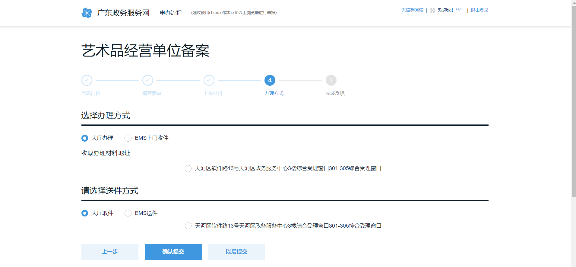 选择收件方式,如果此事项需要收取纸质版原件,选择EMS上门收件申报提交后,会有EMS工作人员上门收取材料,需留意短信和电话;选择大厅办理需要到对应大厅窗口提交 选择送件方式,如果此事项办结后会产生纸质版许可材料,选择EMS送件,业务办结后会EMS邮寄到您填写的邮寄地址,需留意短信和电话;选择大厅办理需要到对应大厅窗口领取。如下图: