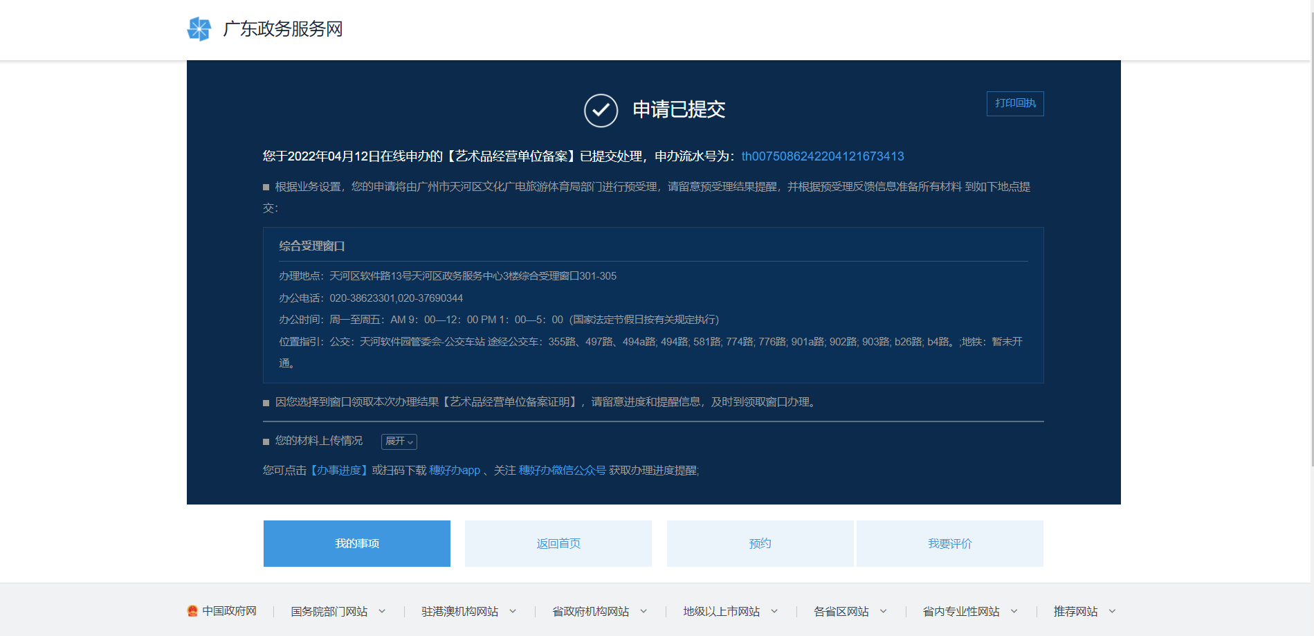 填写完所有申报信息后点击确认提交会提示申请结果,点击打印回执可以打印电子回执,如下图: